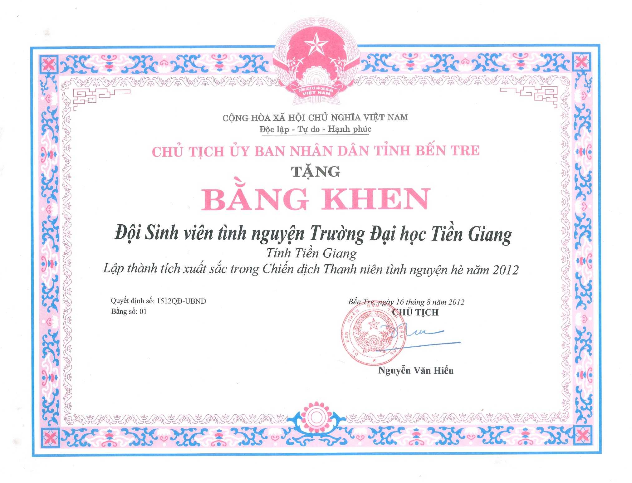 Bằng khen Chủ tịch Ủy ban Nhân dân tỉnh Bến Tre năm 2012