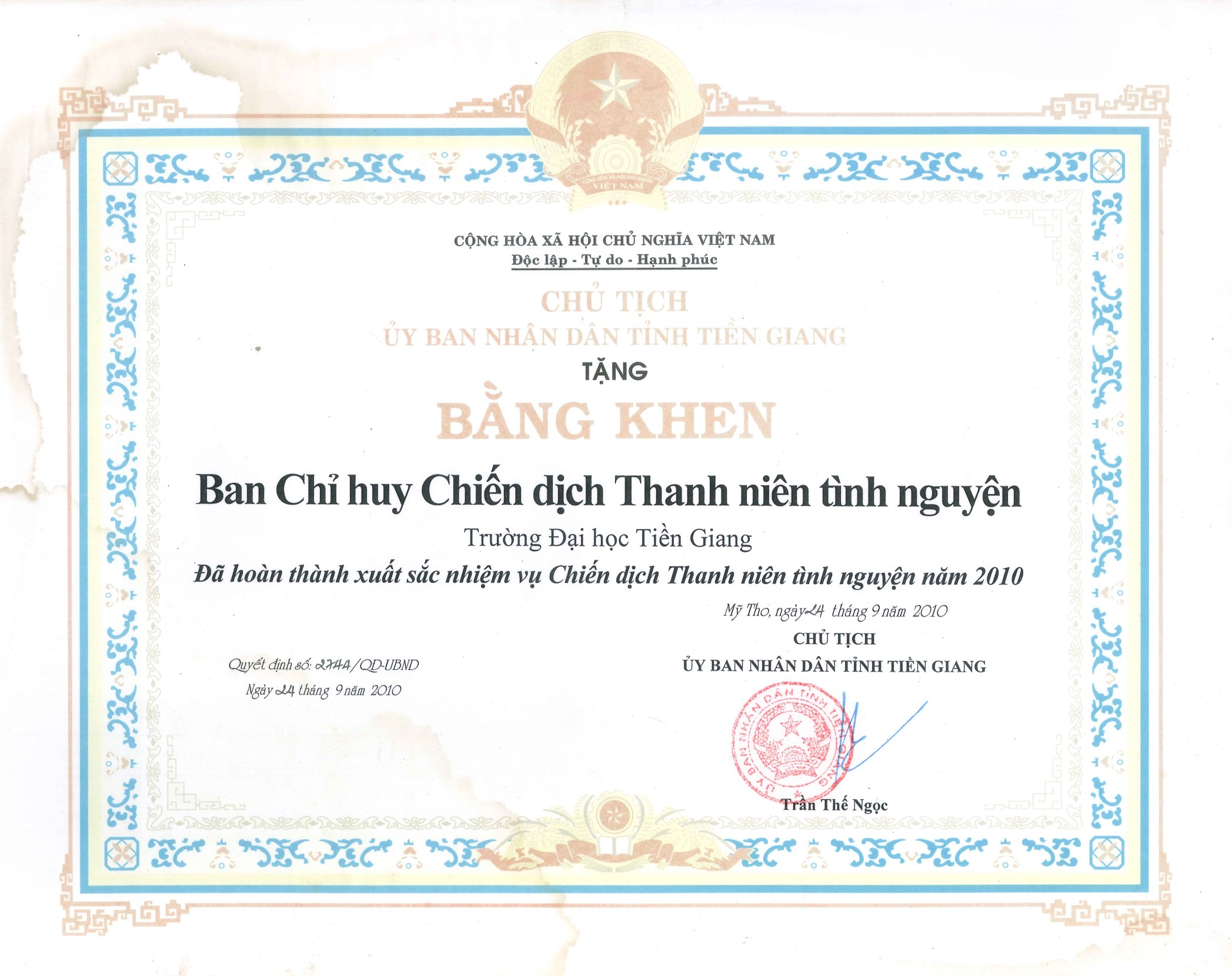 Bằng khen Chủ tịch Ủy ban Nhân dân tỉnh Tiền Giang năm 2010