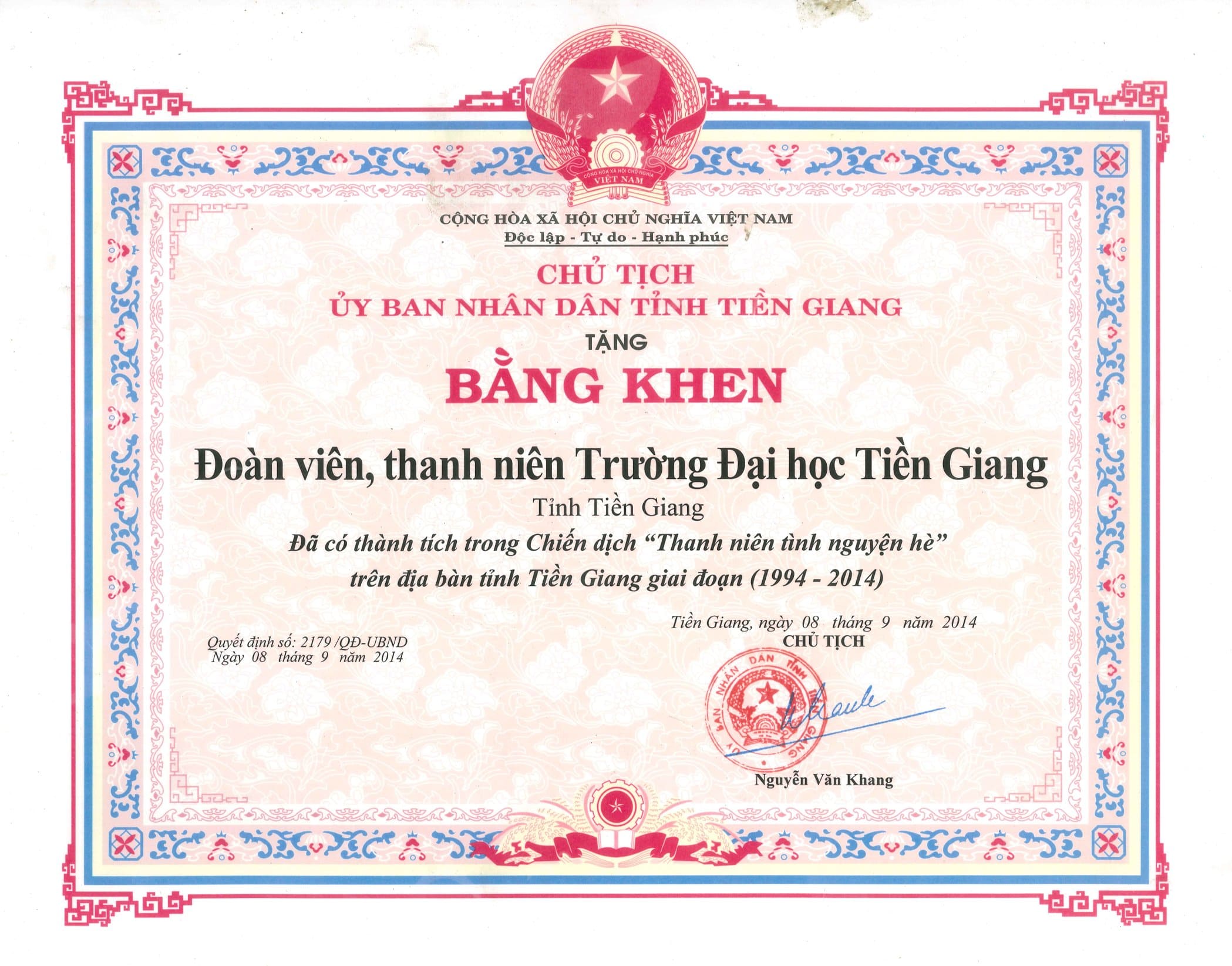 Bằng khen Chủ tịch Ủy ban Nhân dân tỉnh Tiền Giang năm 2014