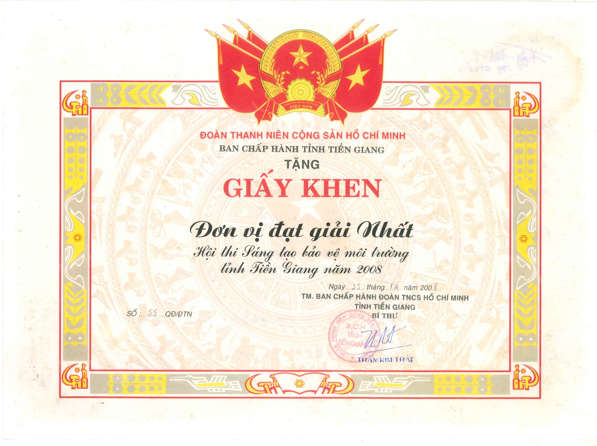 Giấy khen Ban Chấp hành tỉnh Tiền Giang Năm 2008