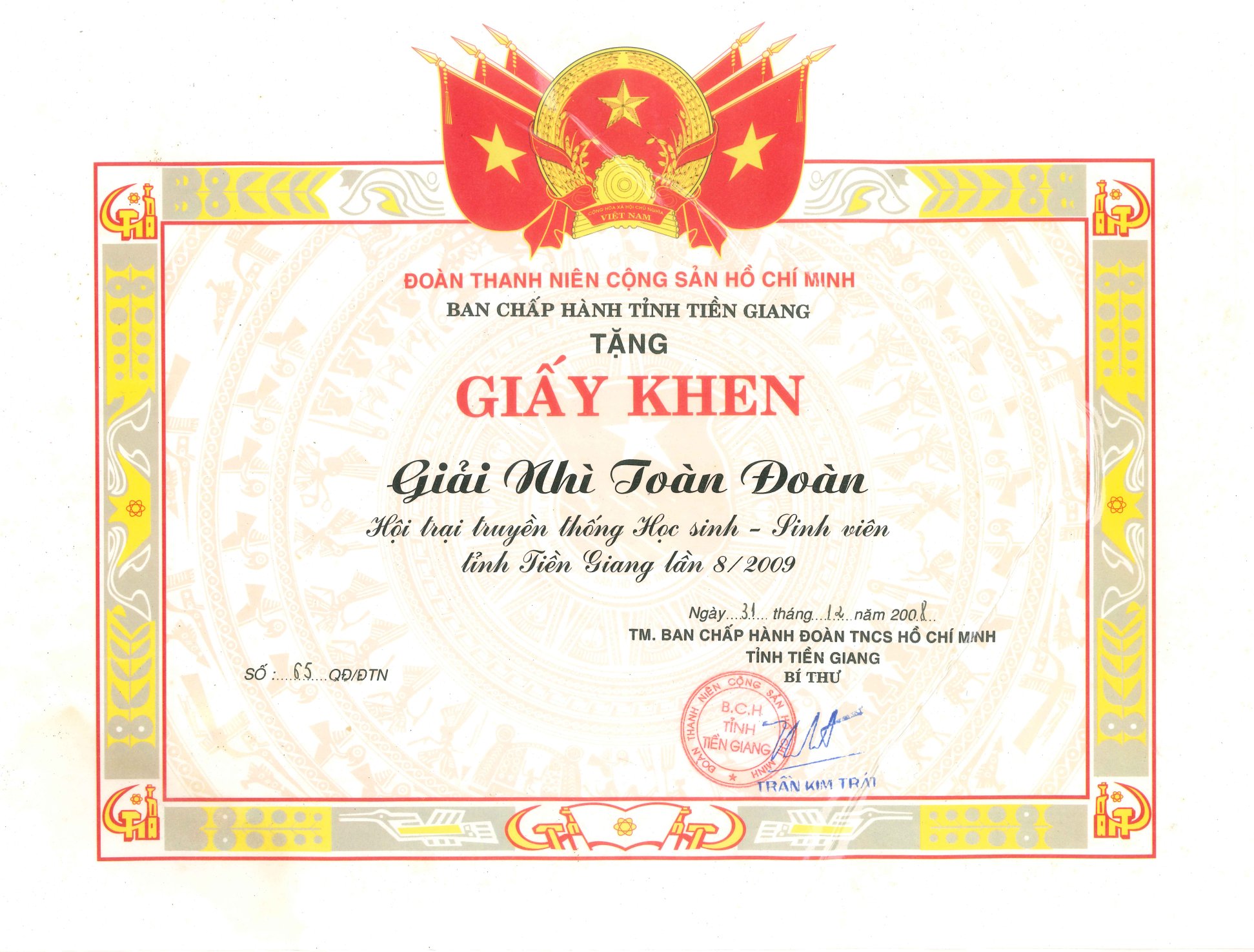Giấy khen Ban Chấp hành tỉnh Tiền Giang Năm 2008