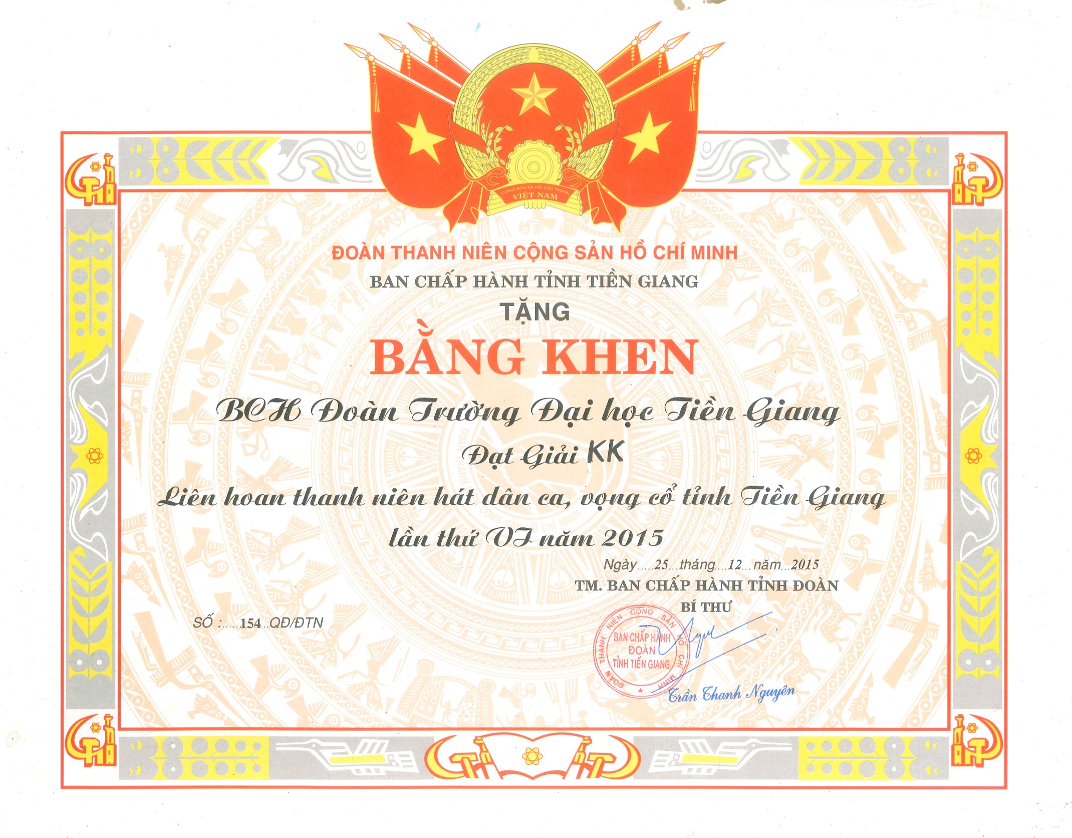 Giấy khen Ban Chấp hành tỉnh Tiền Giang năm 2015