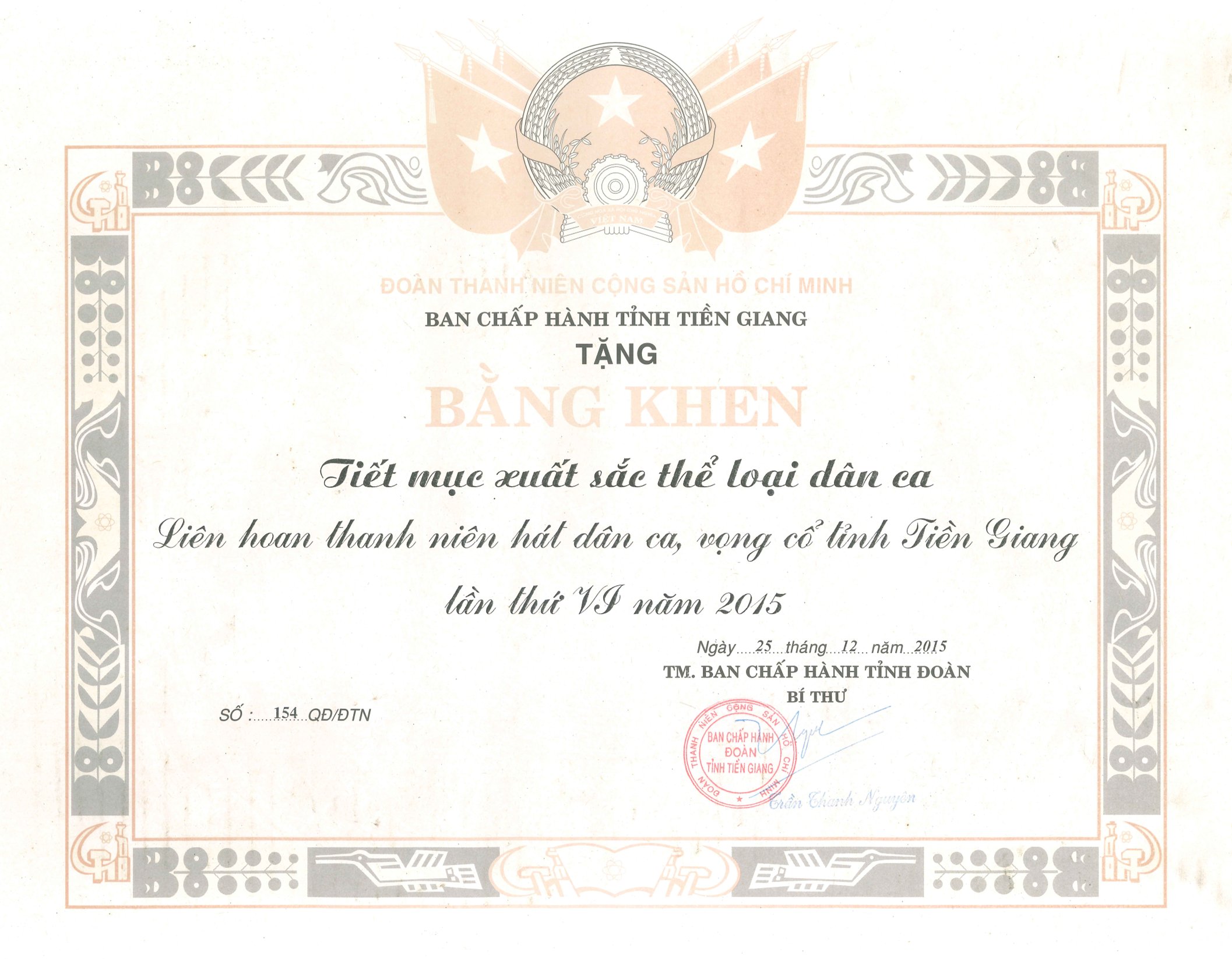Giấy khen Ban Chấp hành tỉnh Tiền Giang năm 2015