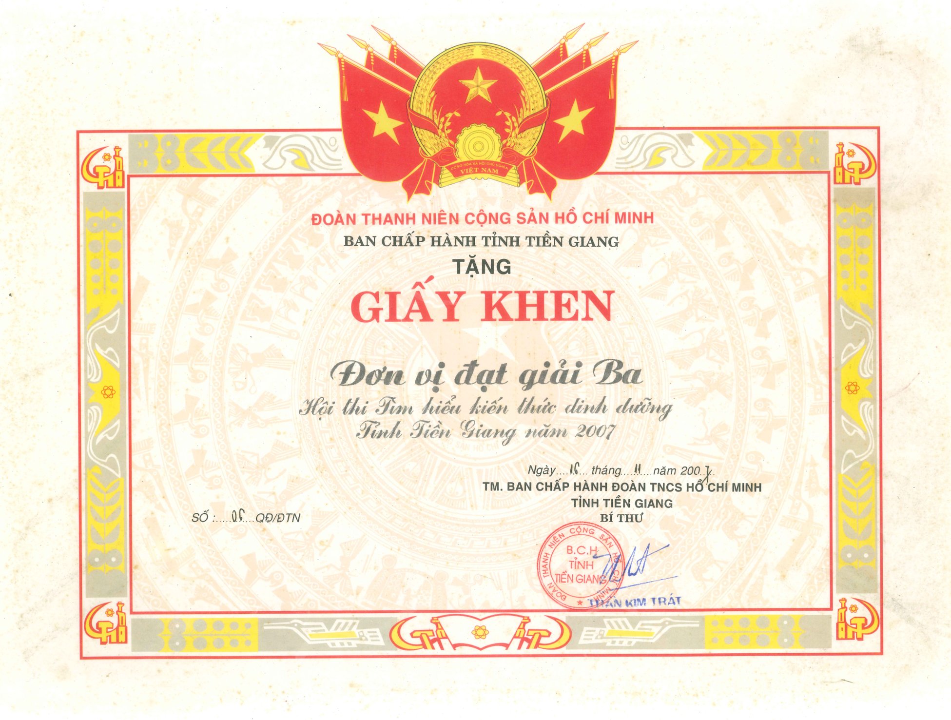 Đơn vị đạt giải Ba Hội thi Tìm hiểu kiến thức dinh dưỡng Tỉnh Tiền Giang năm 2007