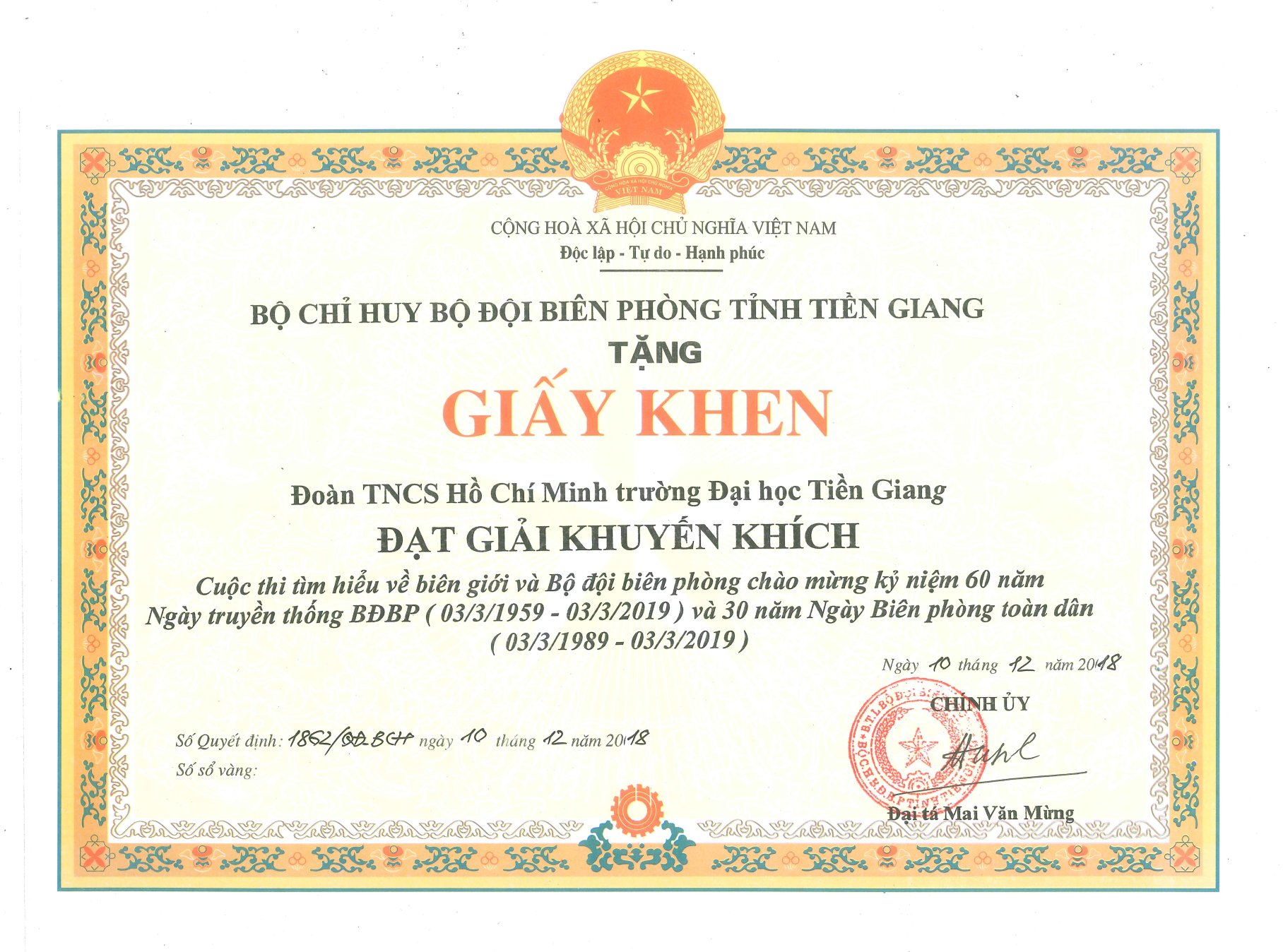 Giấy khen Bộ chỉ huy Bộ đội Biên phòng tỉnh Tiền Giang năm 2018