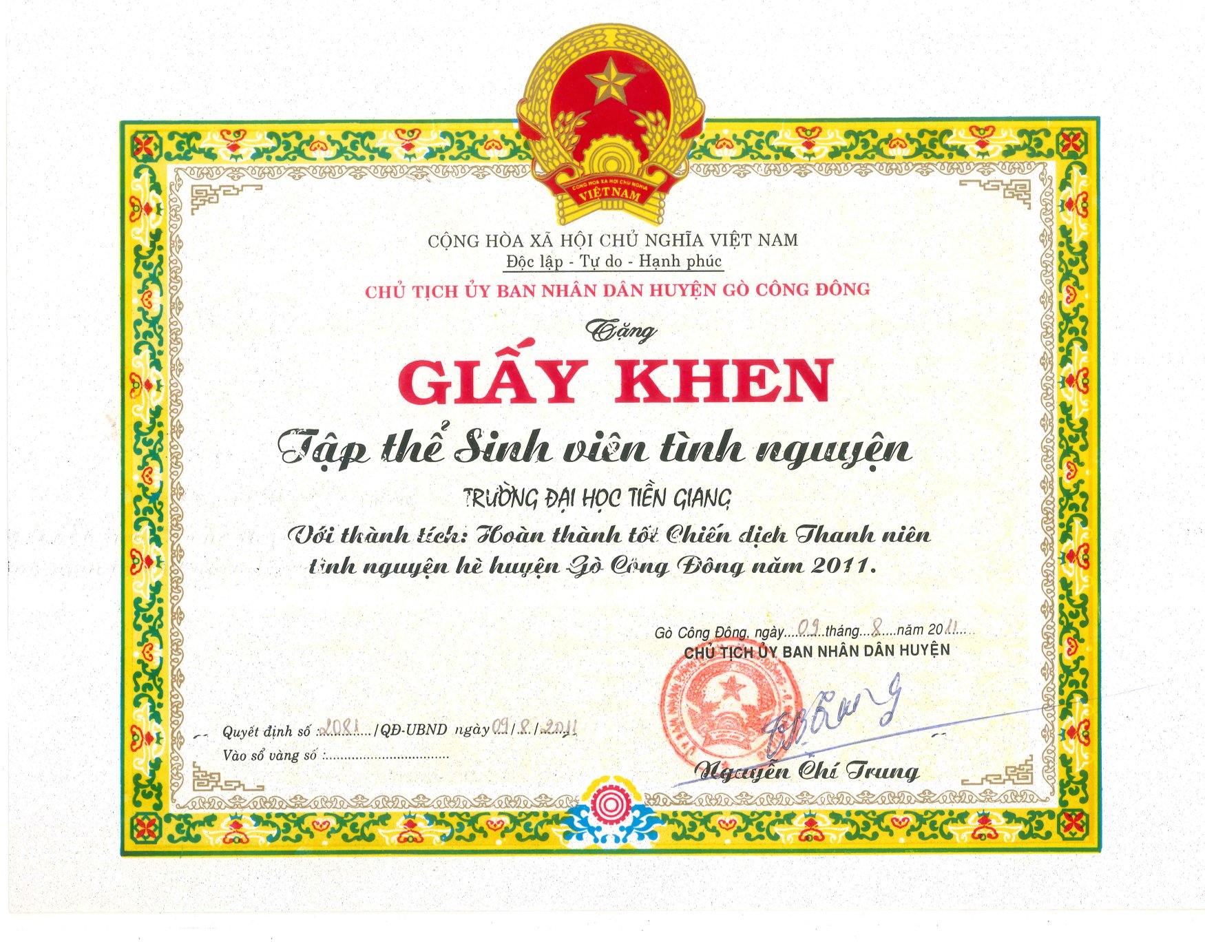 Giấy khen Chủ tịch Ủy ban Nhân dân huyện Gò Công Đông năm 2011