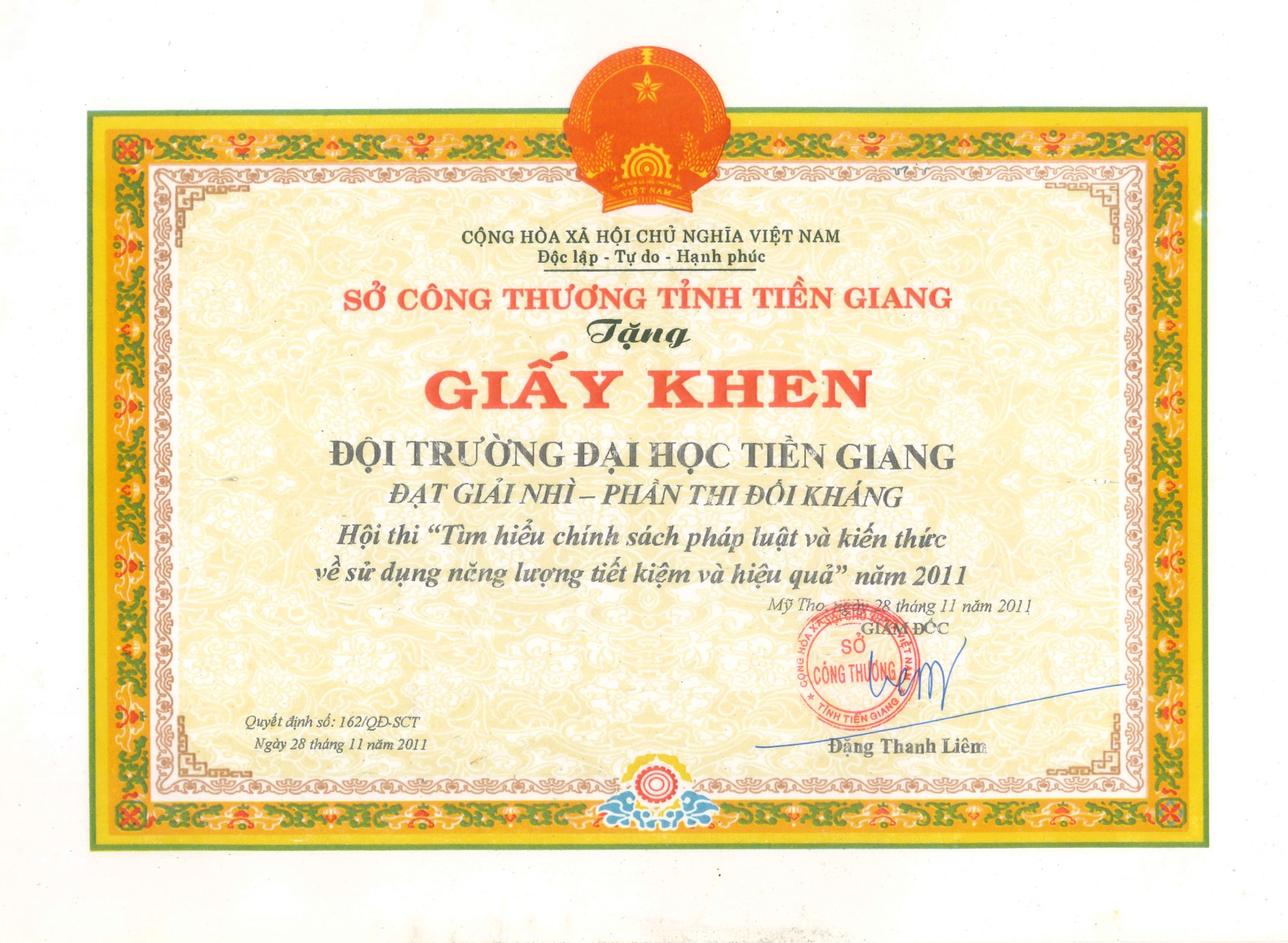 Giấy khen Sở Công thương tỉnh Tiền Giang năm 2011