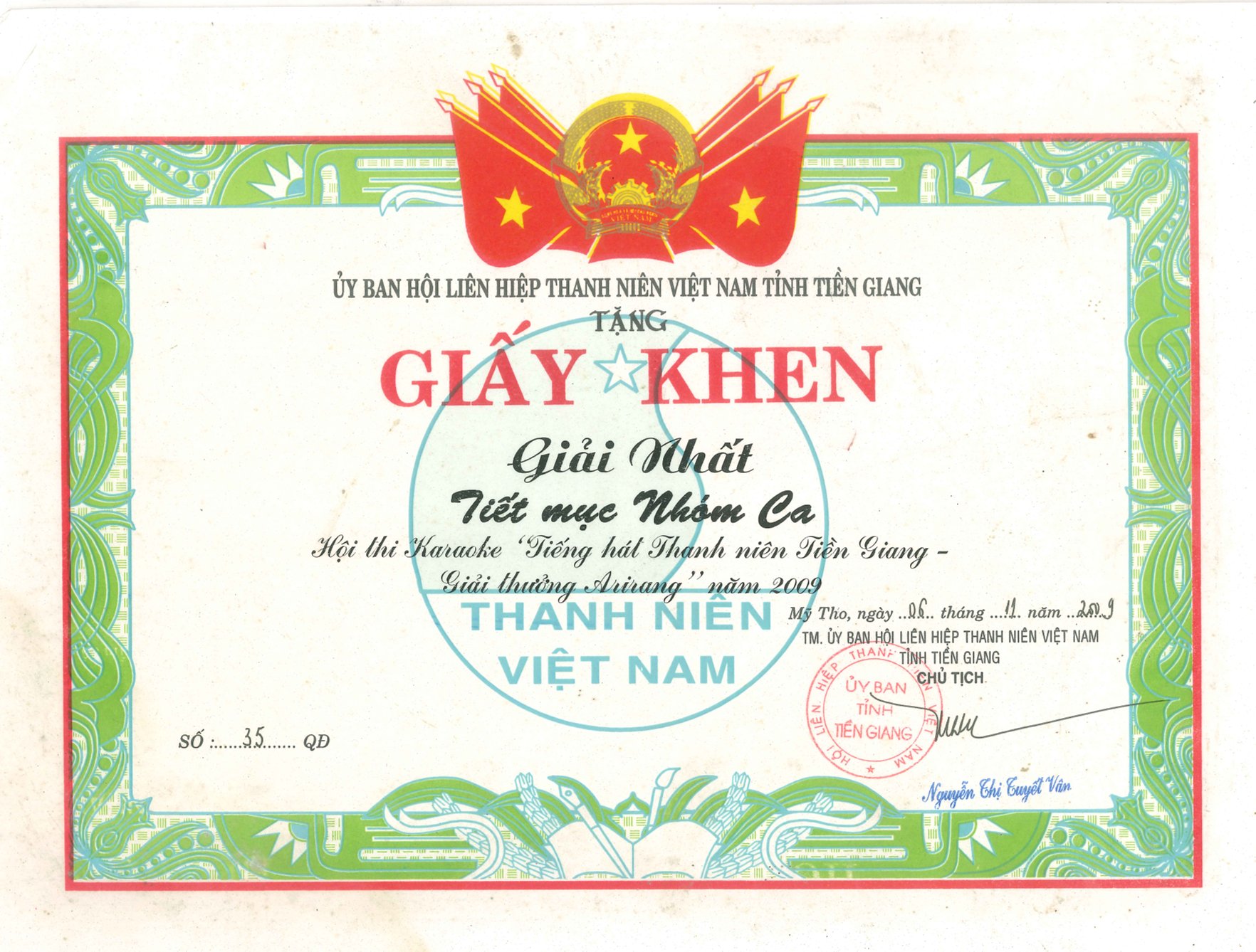 Giấy khen Ủy ban Hội Liên hiệp Thanh niên Việt Nam tỉnh Tiền Giang năm 2009