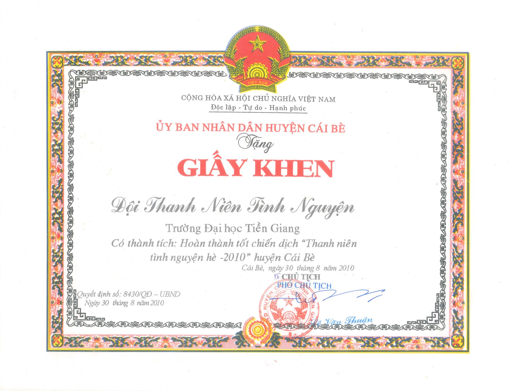 Giấy khen Ủy ban Nhân dân huyện Cái Bè năm 2010