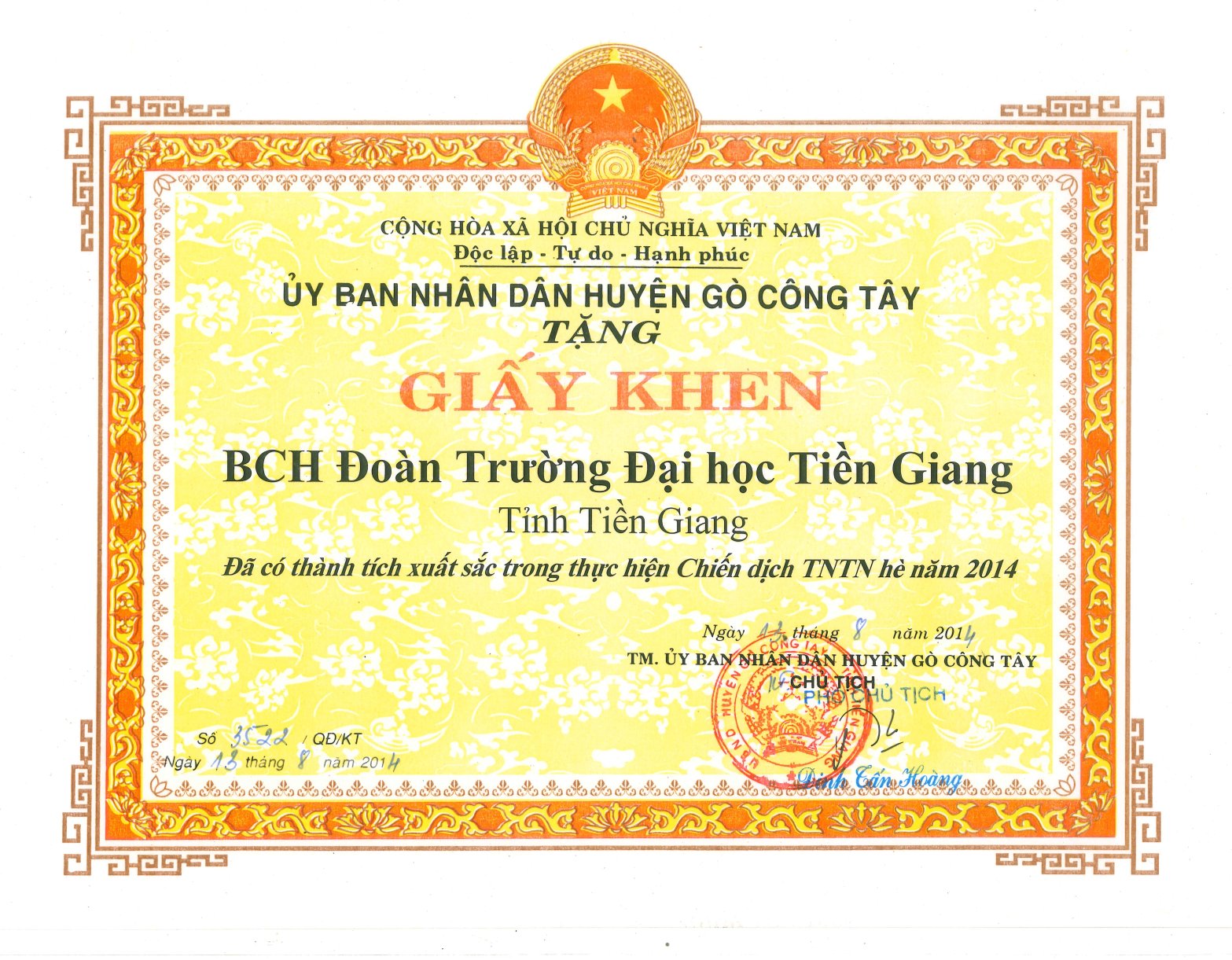 Giấy khen Ủy ban Nhân dân huyện Gò Công Tây năm 2014