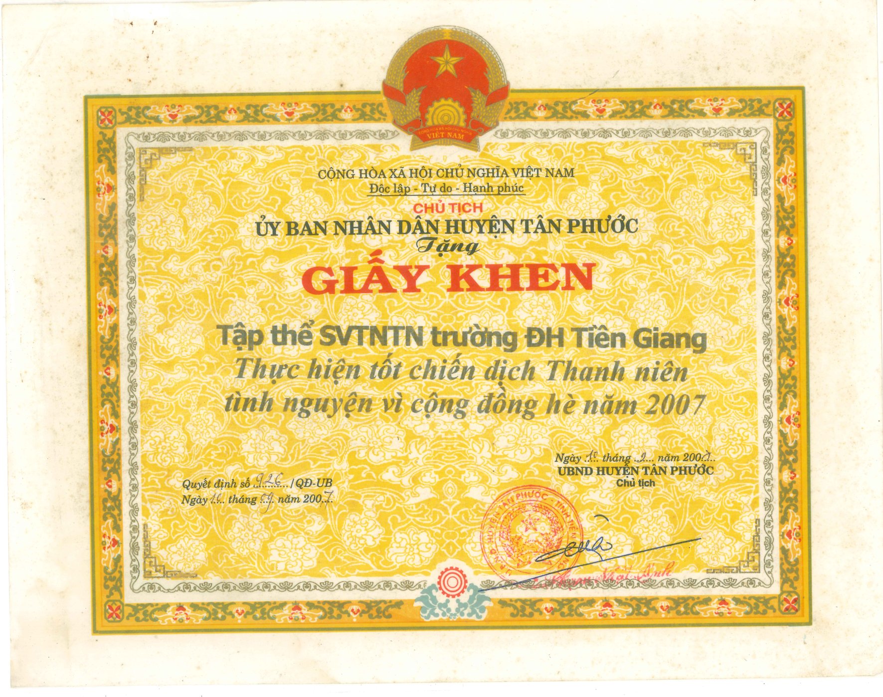 Giấy khen Ủy ban Nhân dân huyện Tân Phước năm 2007
